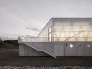 Il sistema di travi metalliche scorrevoli definisce uno spazio protetto e di transizione verso il bar al primo piano, accessibile tramite una rampa esterna, mentre la terrazza offre una vista sul bosco di betulle che separa l'edificio dal parcheggio. I due livelli intessono un rapporto simbolico con la terra e con il cielo, tradotti in una base in calcestruzzo grezzo e un volume superiore in vetro e policarbonato. Quest'ultimo, riflettendo i colori del cielo, varia al variare della luce, mentre il contrasto materico e formale genera una tensione visiva che dà risalto alla semplicità delle geometrie.