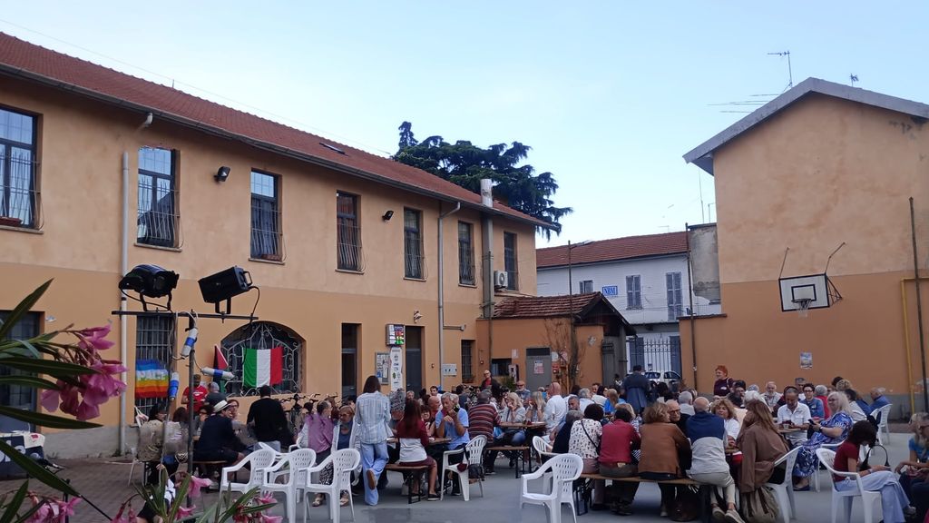 Mentre gli astanti si dedicavano all’aperitivo, esponenti delle associazioni hanno preso la parola. Tra i temi toccati, l’antifascismo, i diritti, la solidarietà, l’immigrazione, la guerra, e poi Gaza e la Palestina (la cui bandiera era appesa insieme al tricolore).