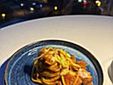 Tra le portate servite: ostrica fritta con bisque di gamberi e salsa al caramello; carpaccio di tonno con fichi freschi, cipolla in agrodolce e salsa alle foglie di fico; risotto ai gamberi di Sanremo e tartufo nero; tagliolino con gamberi, zafferano e fiori di zucchina.