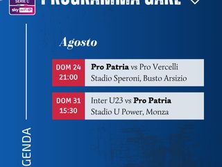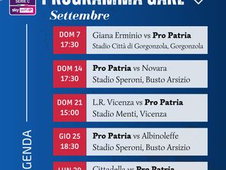 Esordio in notturna. Sarà una domenica sera a inaugurare la nuova avventura in campionato della Pro Patria, riammessa in Serie C. La Lega Pro ha ufficializzato oggi date e orari delle prime sette giornate del campionato 2025/26, che vedrà i tigrotti, come si sapeva da lunedì (LEGGI QUI), iniziare dallo stadio “Carlo Speroni”, domenica 24 agosto alle ore 21.00 contro la Pro Vercelli. Di seguito, il calendario con date e orari dalla seconda alla settima giornata, con quattro domeniche, un giovedì e un lunedì sera. Un cammino fitto e impegnativo per la squadra di Leandro Greco, ma anche questo era già noto.
