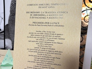 Domani, 6 agosto, tutto il mondo ricorderà l’80esimo anniversario del bombardamento atomico su Hiroshima, seguito il 9 agosto da quello su Nagasaki. Come da consuetudine, il Comitato Amici del Tempio civico ha predisposto un altare dedicato alle vittime e anche il sindaco Emanuele Antonelli ha scritto un messaggio che è disponibile nella chiesetta di fronte al Municipio.