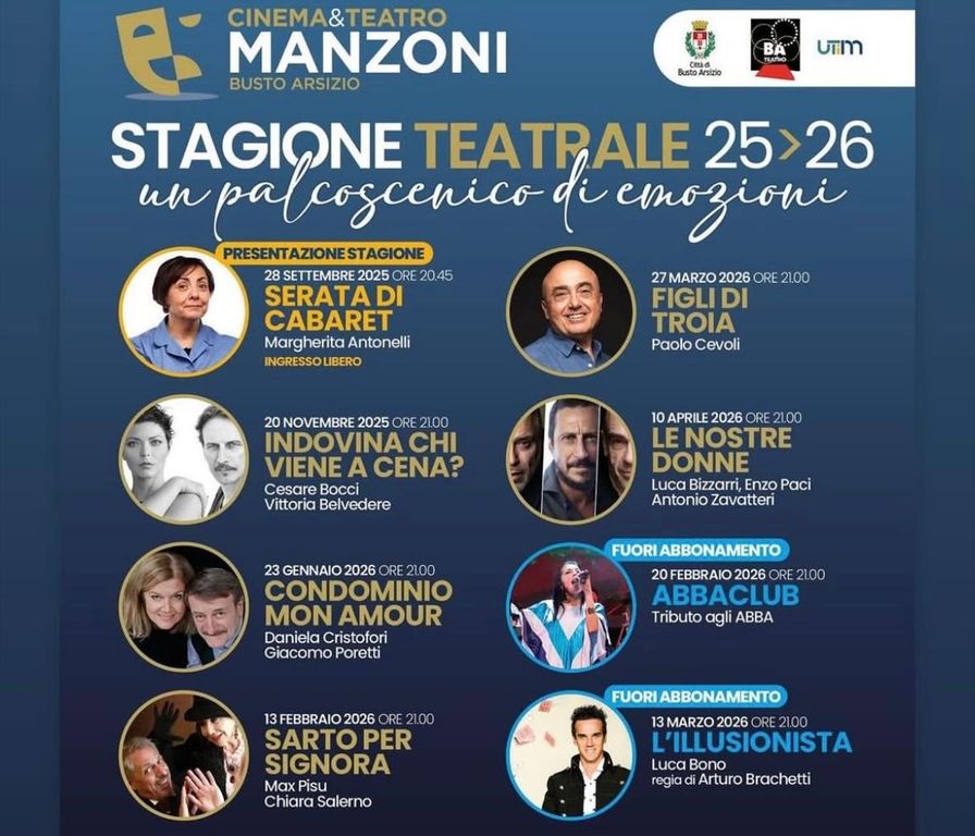 Il sipario del Cinema & Teatro Manzoni di Busto Arsizio è pronto ad alzarsi su una nuova stagione teatrale che promette di regalare al pubblico un vero e proprio “palcoscenico di emozioni”. La programmazione 2025/26, presentata ufficialmente con grande entusiasmo, unisce comicità, prosa, spettacoli di grande intensità e appuntamenti fuori abbonamento che arricchiscono ulteriormente il cartellone.