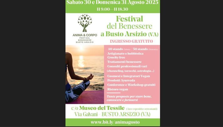 Oggi e domani, 31 agosto, Busto Arsizio ospita un appuntamento speciale dedicato al benessere e alla crescita personale. Come di consueto al Museo del Tessile, con ingresso gratuito, si terrà infatti il Festival del Benessere Anima & Corpo, aperto al pubblico dalle 9 alle 18.30. L’iniziativa offrirà un ricco programma di attività e stand per chi desidera prendersi cura di sé e scoprire nuove pratiche legate al benessere psicofisico.