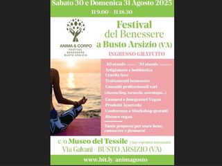 Oggi e domani, 31 agosto, Busto Arsizio ospita un appuntamento speciale dedicato al benessere e alla crescita personale. Come di consueto al Museo del Tessile, con ingresso gratuito, si terrà infatti il Festival del Benessere Anima & Corpo, aperto al pubblico dalle 9 alle 18.30. L’iniziativa offrirà un ricco programma di attività e stand per chi desidera prendersi cura di sé e scoprire nuove pratiche legate al benessere psicofisico.