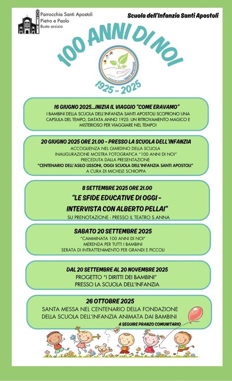 Ma il cammino non finisce qui. Anzi, dal 20 settembre al 20 novembre prenderà il via il progetto “I diritti dei bambini”, che coinvolgerà la Scuola dell’Infanzia con attività quotidiane e interdisciplinari per vivere e interiorizzare questo importante valore e regola sociale. Altro appuntamento, nel mentre, molto atteso è quello del 26 ottobre (“giornata del centenario”) con la Santa Messa nel centenario della Fondazione animata dai bambini con pranzo comunitario a seguire. Per informazioni chiamare il numero 351.5654050 (Scuola Infanzia Santi Apostoli).