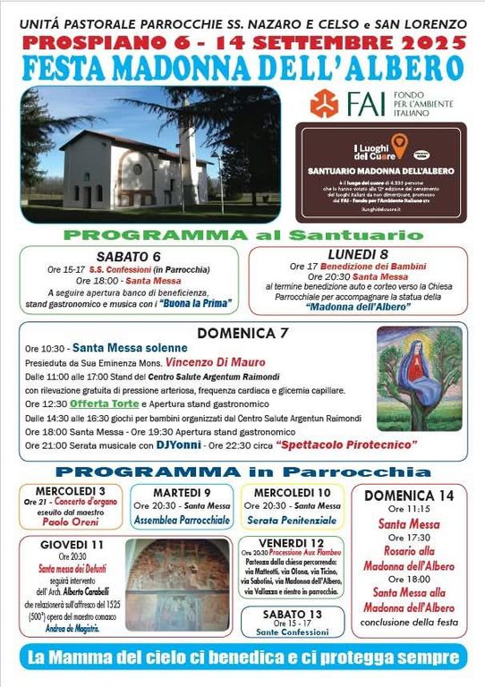Ma il santuario della Madonna dell’Albero non sarà protagonista della sola giornata di domenica; le sue porte, infatti, si apriranno già sabato 6 settembre per la Santa Messa delle 18, a cui seguirà l’apertura banco di beneficenza, quella dello stand gastronomico e l’esibizione musicale dei "Buona la Prima".