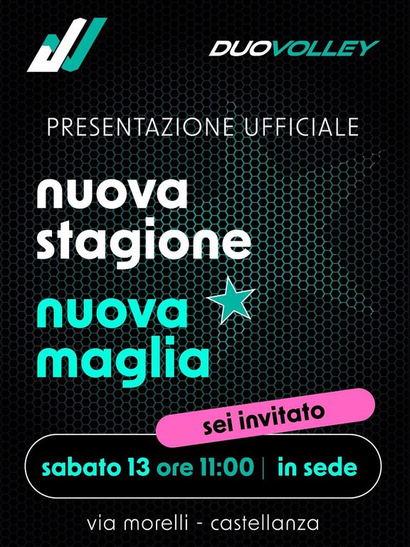 E a suggellare un weekend all'insegna della pallavolo femminile, sabato 13 settembre (alle ore 11) la società Duo Volley del presidente Luigi Landonio e dei suoi collaboratori, il DG Steve Pozzi e il DS Roberto Asta, nella suggestiva location della Stazione Nord di Castellanza (sede sociale di via Morelli), celebrerà un altro momento importante, alla presenza di autorità, sponsor, atlete e familiari. La presentazione di tutte le squadre neroverdi ai nastri di partenza della stagione 2025/26 (dalla B2 al minivolley, passando per la serie D, la Prima/Seconda/Terza Divisione, l’Under 18 nera e verde, l’Under 16 nera e verde e - in collaborazione con Marnate - l'Under 14, l'Under 13, l'Under 12), con i rispettivi staff tecnici e dirigenziali, e l'attesissima consegna delle nuove divise da gioco color tiffany a tutte le 150 "comete".