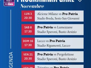 Derby lombardo per la quattordicesima giornata: la Pro Patria farà visita al Lecco, domenica 16 novembre alle 17.30. Poi un doppio anticipo serale chiuderà il ciclo: prima la gara interna con la Pergolettese, venerdì 21 novembre alle 20.30, quindi la trasferta al “Nereo Rocco” contro la Triestina, venerdì 28 novembre, sempre alle 20.30.