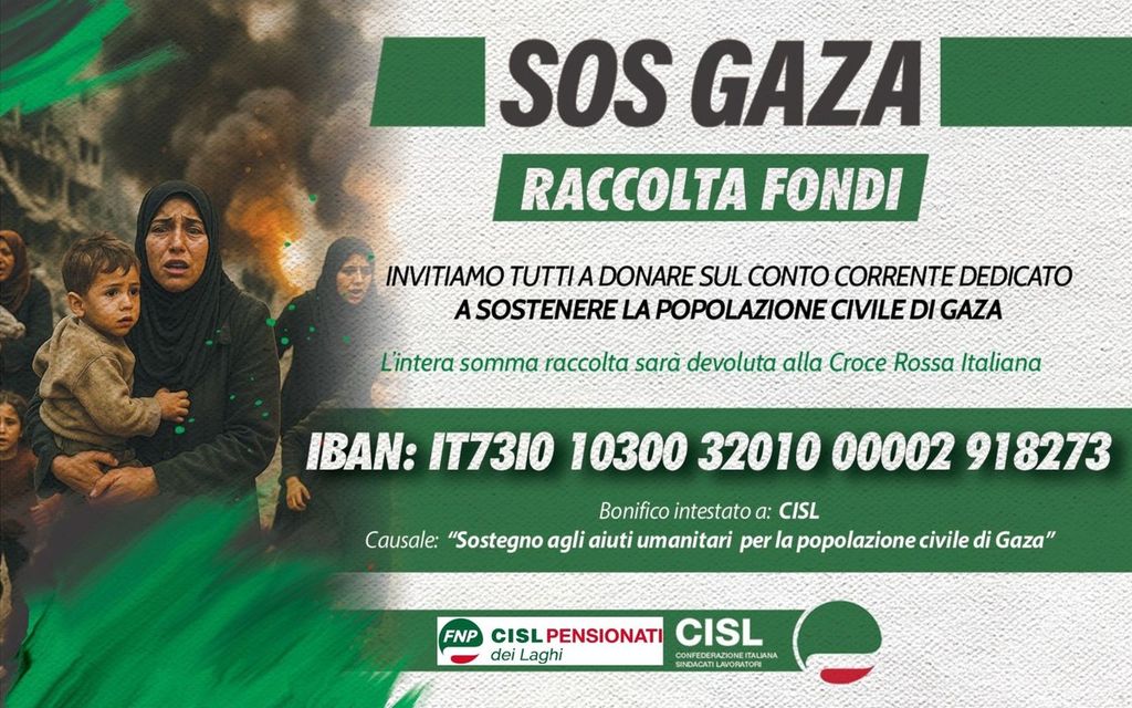 «Non possiamo restare indifferenti di fronte a ciò che sta accadendo – dichiara Dario Grilanda, Segretario Generale della FNP CISL dei Laghi –. Con questa iniziativa vogliamo trasformare le parole in azioni concrete di solidarietà. La raccolta fondi nazionale rappresenta un impegno collettivo per sostenere la popolazione di Gaza attraverso l’intervento della Croce Rossa Italiana e come Fnp dei Laghi attiveremo tutte le iniziative necessarie per garantire la massima partecipazione da parte dei nostri iscritti e di tutti coloro che si recheranno nelle sedi sindacali. Insieme alla CISL invitiamo tutti i cittadini, le associazioni e le realtà del territorio ad aderire».