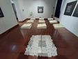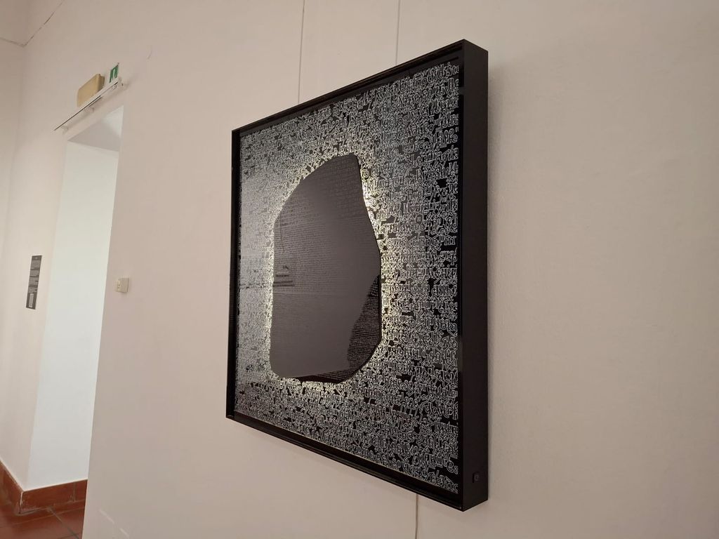 Il segno è il principale filo conduttore in quadri dalla forte impronta grafica, in cui le lettere si riconoscono ma non risultano immediatamente leggibili, a comporre parole e riflessioni secondo schemi tradizionali o bustrofedici, veri e propri percorsi. C’è l’irruzione della guerra, libri trafitti e svuotati da aculei, alla cui base giacciono nomi di bambini morti a Gaza. C’è, in un involucro trasparente, il proiettile ricevuto dal vescovo di Amman e che si era conficcato in un muro della sua casa durante i fatti del “Settembre nero”, nel 1970, imprigionato sotto la scritta "Disarm". Ci sono i simboli, il simbolo «…che unisce il visibile e l’invisibile».