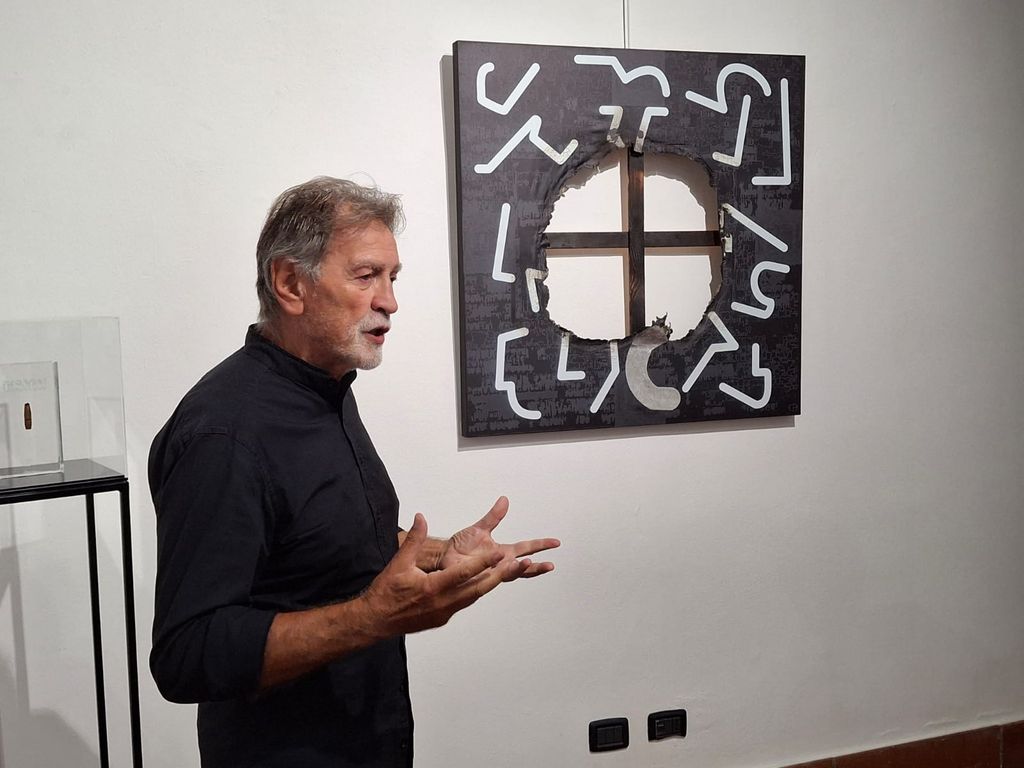 «Lavoro sul segno derivato dalla scrittura, su documenti storici, come la Stele di Rosetta, e altri recenti. Ritorno all’origine del segno, per giungere a un “alfabeto inesistente”». Parola di Claudio Benzoni, illustratore e grafic designer, già docente al Liceo Artistico di Busto, che a palazzo Marliani Cicogna, nelle sale di "Uno spazio per l'arte", espone 22 opere. La mostra “Ante litteram – Permanente inizio del segno” e visitabile fino al 19 ottobre. Ed è destinata a lasciare traccia negli spazi espositivi di piazza Vittorio Emanuele II: «Donerò due opere».