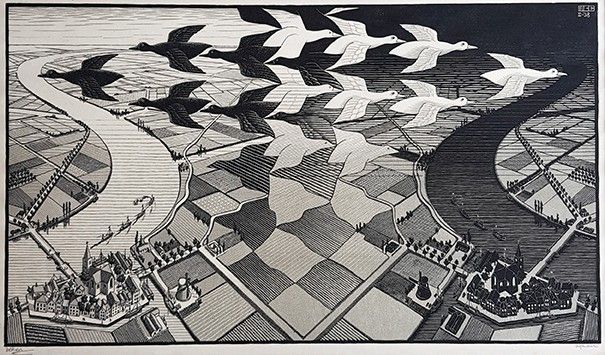 Maurits Cornelis Escher (Olanda 1898-1972) ha unito arte e matematica con le proprie opere ed architetture impossibili. Su questo terreno Escher ha lavorato per tutta la sua vita con passione e minuziosità, tra intuizioni e percezioni. Arte e scienza si fondono nelle opere dell’artista olandese con una chiave di accesso del tutto personale, in un “universo grafico” che coglie anche dall’arte islamica tratti inediti senza precedenti (con spunti tratti dalle decorazioni dell’Alhambra di Gradada e della Mezquita di Cordova). La mostra ricorda come il genio di Escher si sia confrontato con ambiti applicati al design grafico: nella sua vita professionale l’artista realizza non solo stampe artistiche in fogli sciolti, ma anche illustrazioni, copertine di libri e riviste, ex libris, biglietti d’auguri, motivi decorativi per carta da regalo, tessuti, banconote, ecc… I lavori su commissione non hanno mai rappresentato per l’artista una parentesi minore, ma un terreno fertile per affinare il suo linguaggio visivo.