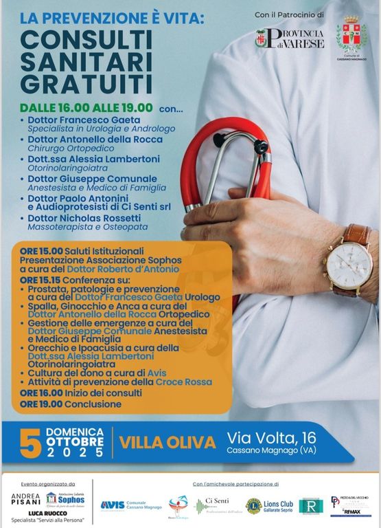All’interno della cornice di Villa Oliva a Cassano Magnago (via Volta), domenica 5 ottobre dalle 15.00 alle 19.00 circa, l’Associazione Sophos, con il consigliere comunale Andrea Pisani, proporrà una giornata dedicata alla prevenzione in campo medico e sanitario. Sarà un momento all’insegna dell’ascolto, della condivisone e dell’attenzione verso la salute che rappresenta il bene e la ricchezza principale delle Persone, nell’ottica di diffondere la cultura della prevenzione come strumento di miglioramento dello status psico-fisico dei singoli.