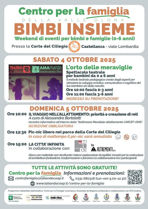Il Centro per la Famiglia della Valle Olona chiude il programma delle iniziative 2024/2025 con un weekend di eventi gratuiti dedicati a bambini e famiglie, in programma sabato 4 e domenica 5 ottobre alla Corte del Ciliegio di Castellanza, in viale Lombardia.