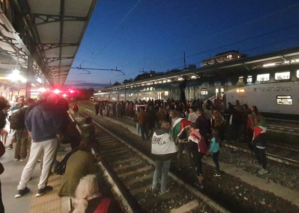 Con bandiere della Palestina e della pace, tra cori e striscioni, hanno percorso le vie del centro, per poi puntare lo scalo di piazza Volontari della Libertà. Il primo tentativo di accedere ai binari passando dal parcheggio di via Venezia è andato a vuoto grazie all’opposizione delle forze dell’ordine, che hanno poi tentato di impedire ai manifestanti, entrati in stazione, l’accesso ai binari. Il blocco però è stato forzato e la circolazione dei treni è stata interrotta.