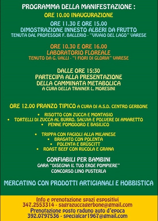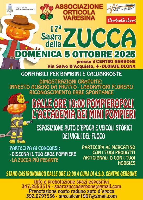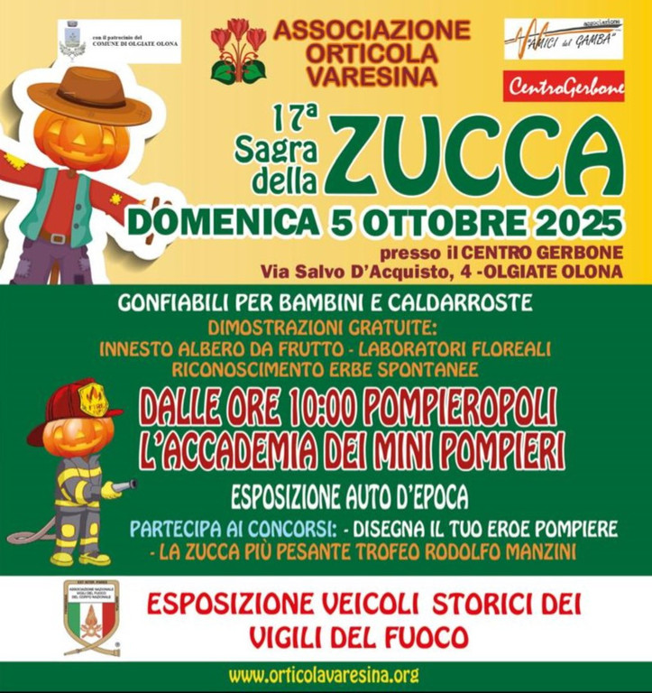 Come sempre, le star dell’evento - organizzato in collaborazione con l’Associazione Orticola Varesina - saranno le zucche, che faranno bella mostra di sé sui banchi di molti espositori e all’interno del menù tipico del periodo, offerto a partire dalle ore 12 dai volontari dell’A.S.D. Centro Gerbone.