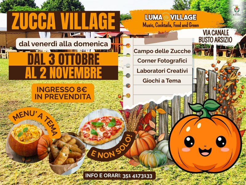 Al Luma Village Via Canale (info: 351 417 3133) “Zucca Village” (dal venerdì alla domenica) Campo delle zucche – Corner fotografici – Laboratori creativi e giochi.