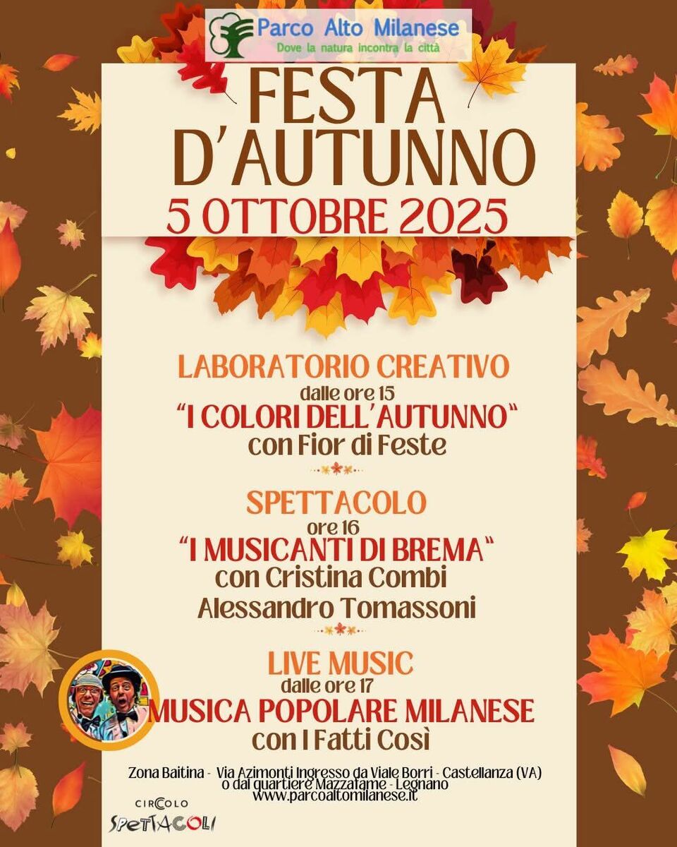 Domenica pomeriggio 5 ottobre al Parco Alto Milanese nella zona della Baitina un pomeriggio di colori, spettacoli e musica dal vivo per festeggiare l’autunno. Ingresso alle attività libero e gratuito.