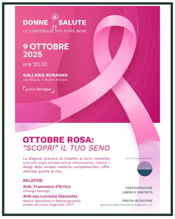 Nell’ambito di “Donne in salute – Le conferenze per stare bene”, appuntamenti organizzati in collaborazione con San Carlo Istituto Clinico, la Galleria Boragno di via Milano propone, giovedì 9 ottobre, alle 20.30, un appuntamento con Francesco D’Errico, chirurgo senologo, e Lucrezia Giaramita, specialista in radiodiagnostica di San Carlo Diagnostic Cdtt.