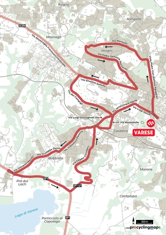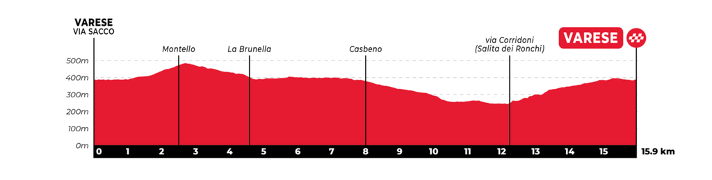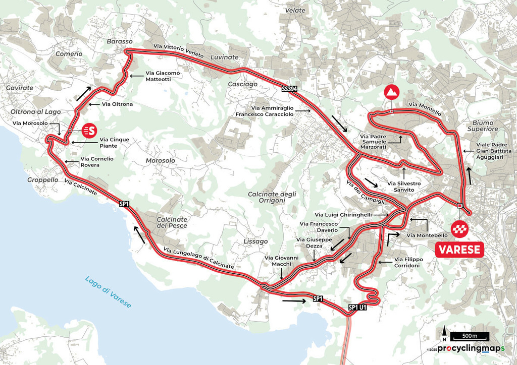 Qui sotto trovate anche la planimetria e l'altimetria del tracciato e dei circuiti finali che decidono la corsa, un percorso di 200,3 chilometri che ricalca quello dell’edizione scorsa, non disputata per il maltempo con novità importante nel finale. Partenza da Busto Arsizio alle 11.55 con trasferimento a Solbiate Olona, dove ci sarà il via ufficiale (alle 12.15), e da lì passaggio da Fagnano Olona, Cairate, Carnago, Azzate e ingresso nel Comune di Varese. Dopo il primo passaggio sui Ronchi (1,9 chilometri al 5,3% di pendenza media), transito sul traguardo di via Sacco e, da lì, via ai sette giri "corti", con salite del Montello e, appunto, dei Ronchi.