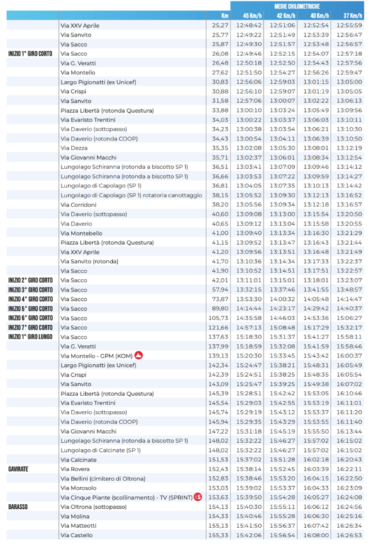 Sotto in allegato i pettorali degli iscritti, gara per gara, e nella gallery le tabelle orarie con i passaggi paese per paese.