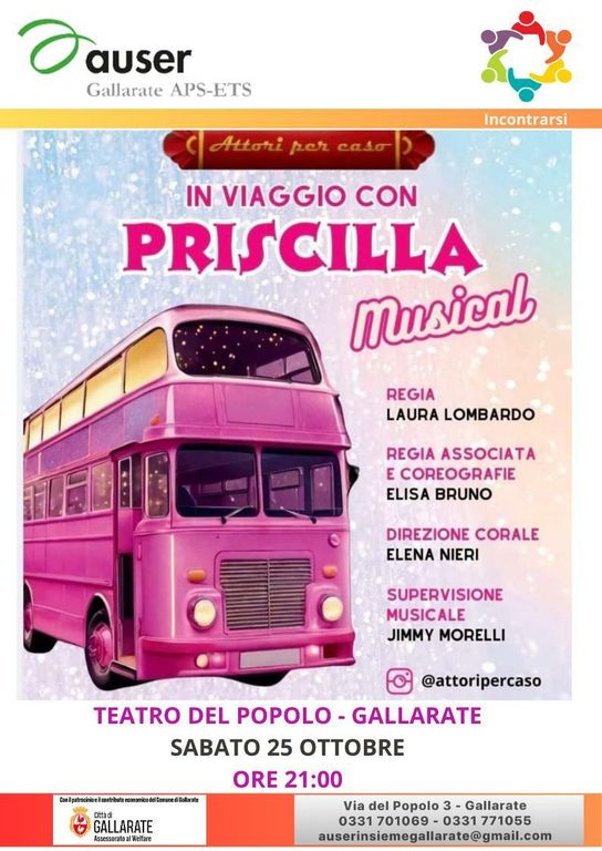 Un viaggio di musica, colori e solidarietà è quello che attende il pubblico del Teatro del Popolo di Gallarate, sabato 25 ottobre alle ore 21, con il ritorno della compagnia “Attori per Caso” di Busto Arsizio. Il gruppo porterà in scena “In viaggio con Priscilla”, musical liberamente tratto dal celebre film e spettacolo “Priscilla, la Regina del deserto”.