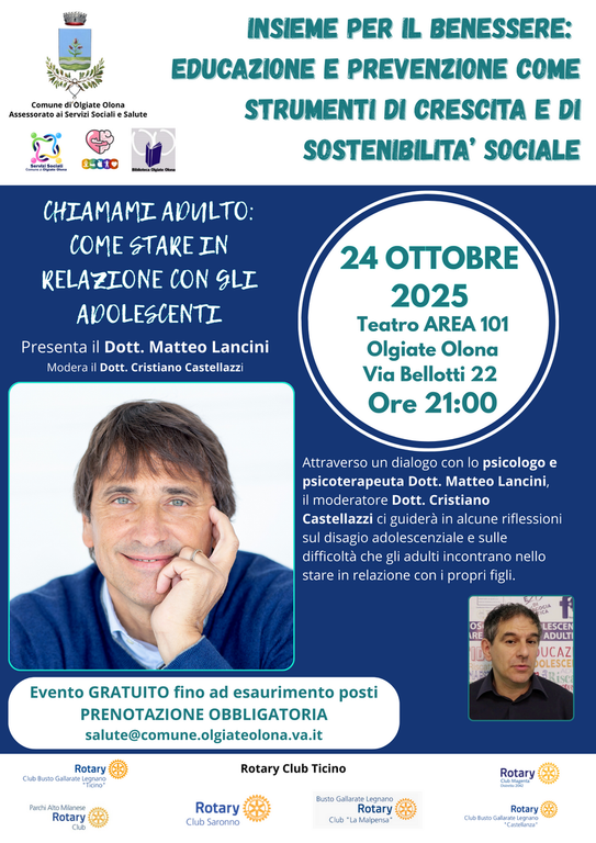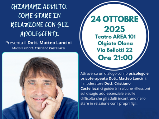 È questo, in sintesi, l’incontro “Chiamami Adulto: come stare in relazione con gli adolescenti”, organizzato dal comune di Olgiate Olona, con il patrocinio dell’assessorato ai servizi sociali, in collaborazione con il Rotary Club Ticino, che si svolgerà all’interno del Cinema Teatro AREA 101 alle 21 di venerdì 24 ottobre.