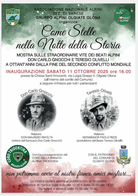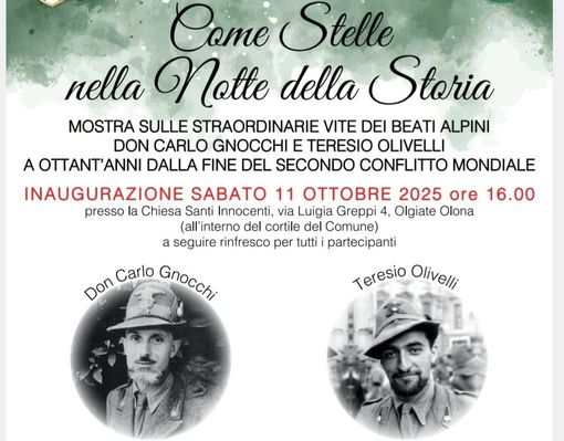 Sarà inaugurata sabato 11 ottobre alle 16 l’esposizione “Come Stelle nella Notte della Storia, mostra sui beati don Carlo Gnocchi e Teresio Olivelli”, organizzata all’interno della chiesa dei Santi Innocenti dal Gruppo Alpini di Olgiate Olona.