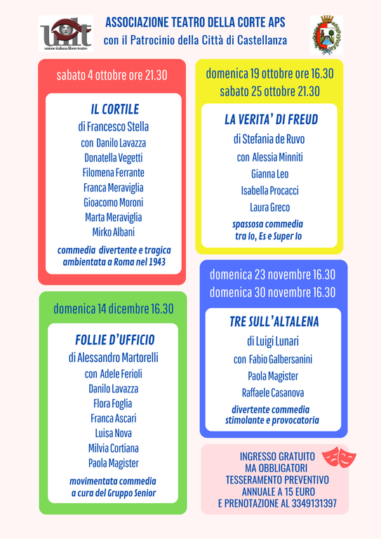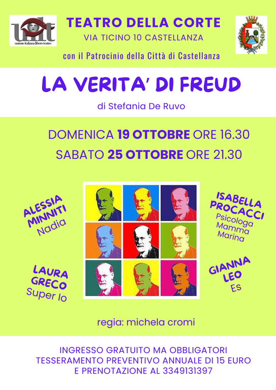 L’iniziativa gode del patrocinio della Città di Castellanza e presenta gli esiti dei laboratori teatrali condotti da Michela Cromi. Il primo appuntamento della stagione porta in scena «La verità di Freud», commedia di Stefania De Ruvo che debutta al Teatro della Corte con doppia rappresentazione domenica 19 ottobre alle 16,30 e sabato 25 ottobre alle 21,30. Lo spettacolo vede protagoniste Alessia Minniti, Gianna Leo, Isabella Procacci e Laura Greco nei panni della giovane scrittrice Nadia e delle forze psichiche e familiari che ne condizionano l'esistenza. Il chiassoso ES, il severo SUPER IO, l’ingombrante MADRE e la spumeggiante SORELLA si contendono la scena in un intreccio tra aspirazioni professionali e pressioni familiari.