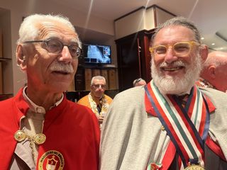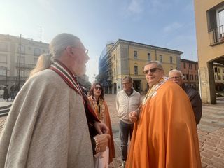 Filippo Toia e Ludovico Brazzelli non hanno ancora il mantello, ma indossano già i primi segni della Confraternita e sono subito intercettati da alcuni bustocchi incuriositi dall'insolito spettacolo domenicale: «Ma che succede, cosa sono tutte queste persone che sfilano? E voi chi rappresentate?». Già sul pezzo, i due giovani spiegano subito che appartengono al Magistero dei Bruscitti di Busto Arsizio e tutti i personaggi che stanno attraversando il centro della città appartengono alle confraternite di tutt'Italia, radunate ufficialmente qui.
