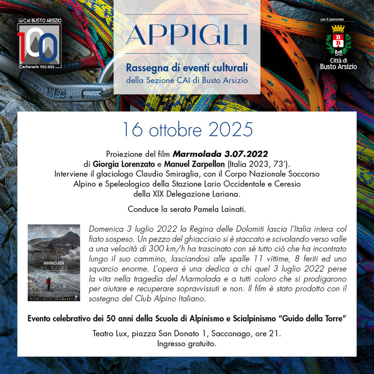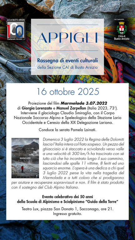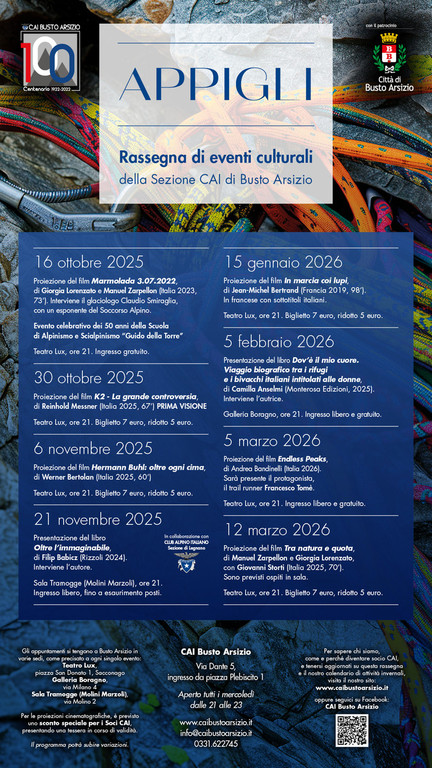La rassegna “Appigli” è organizzata dalla Sezione CAI di Busto Arsizio, in collaborazione con CAI Legnano, Scuola di Alpinismo e Scialpinismo Guido della Torre, Teatro Lux Sacconago. Il programma potrà subire variazioni.