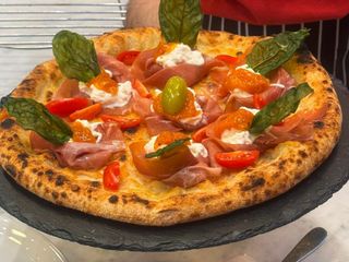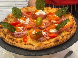A convincere tutti è stata la Fenice, una pizza gourmet buona e bella (l'estetica era la prima dote richiesta) composta da una base di mozzarella con crudo di Parma 18 mesi, stracciatella, marmellatina di pomodorini gialli fatta in casa, basilico cristallizzato, pomodorini rossi oltre a quel tocco in più di sapienza artigiana di Giuseppe Frau.