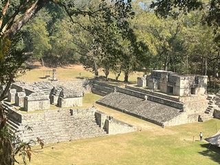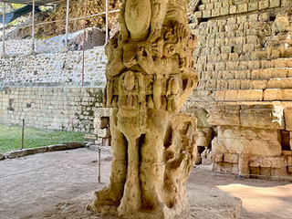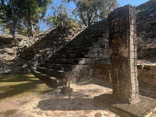 Le prime rovine compaiono dopo pochi passi: muri bassi, scalinate, figure scolpite. Le steli raccontano re e dei, vite che si sono fatte pietra. Una, più imponente, raffigura “18 Conigli”, il sovrano che fece di Copán un centro d’arte e spiritualità. Il suo volto, scolpito con un’eleganza che sfida l’erosione, guarda ancora verso l’orizzonte. Più avanti, la Scalinata dei Geroglifici si erge come una montagna di simboli. I glifi, incisi nei gradini, narrano storie di dinastie, battaglie, sacrifici. Alla base, figure mitiche sorreggono la struttura, come se la fede avesse ancora un peso fisico. Intorno, la giungla osserva in silenzio. Gli uccelli volano bassi, custodi inconsapevoli di un’eredità millenaria. Il vento muove appena le foglie, e per un momento tutto sembra tornare al principio: la pietra, la selva, il respiro della terra. Camminando si percepisce un equilibrio raro, una continuità tra natura e memoria. Copán non parla ad alta voce: sussurra, e chiede ascolto. È un luogo dove il passato non si mostra, ma si lascia intuire, come un’eco nel verde.