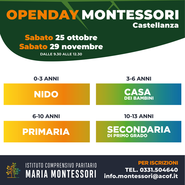 Proprio questi elementi saranno al centro degli Open Day, ai quali si può aderire in anticipo telefonando al numero 0331.504640, mandando un messaggio whatsapp al 342.0150315, oppure scrivendo all’indirizzo di posta elettronica info.montessori@acof.it. Gli stessi riferimenti possono essere però utilizzati anche per prenotare degli appuntamenti di visita in giorni e orari differenti.