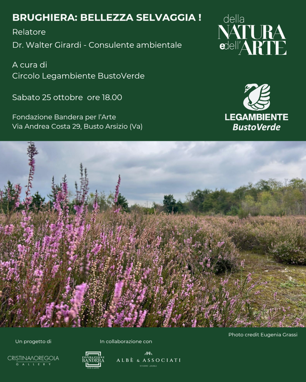 Nell’ambito della rassegna Della Natura e dell’Arte sabato 25 ottobre alle ore 18.00 presso la Fondazione Bandera per l’Arte il Circolo Legambiente BustoVerde presenterà l’incontro Brughiera: bellezza selvaggia! condotto da Walter Girardi, consulente ambientale e guida del parco del Ticino.