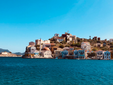 Il pomeriggio dilata i vuoti. Le persiane si socchiudono, il mare cambia gradazione, le facciate delle case rilasciano calore. Si cammina senza una direzione precisa, tra scale ripide, vicoli e cortili nascosti. Kastellorizo è un’opera d’arte urbana che non ha bisogno di pubblico né di applausi. Tra uno scorcio e un balcone fiorito affiora la sagoma del Castello dei Cavalieri, eretto anticamente per controllare la baia. È una sentinella di pietra, memoria di quando questo lembo del Dodecaneso era presidio e frontiera prima che rifugio. Oggi non reclama sguardi, ma li cattura: ricorda, sottovoce, che anche questo luogo ha avuto bisogno di difesa. La vista si apre sull’intera insenatura. Dall’alto il disegno si ricompone: molo, scogli, barche ormeggiate e una linea tesa verso la Turchia, così vicina da sembrare toccabile. Poco oltre, un sentiero conduce alla cappella di San Giorgio, bianca e raccolta, affacciata sull’acqua. È una sosta breve, un invito a prendere fiato.