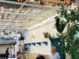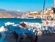 Il porto è la lente attraverso cui tutto si legge. Le imbarcazioni oscillano in un movimento continuo, e il Meltemi — vento caldo dell’Egeo — regala leggerezza ai pensieri. Le sedie rivolte al mare puntano tutte nella stessa direzione, come se l’isola avesse un’unica via di fuga: l’orizzonte. Una viaggiatrice sola, a un tavolo un po’ defilato, osserva in silenzio. Qui si guarda più di quanto si parli. Un uomo apparecchia i tavoli di una taverna: si muove piano, con la calma di chi conosce il valore del tempo e non gli oppone resistenza. Quando si ferma, accenna un sorriso e dice soltanto: «Qui non cambia nulla, è questo il bello». Non aggiunge altro. È abbastanza. In quella frase si condensa la filosofia del luogo: non accelerare, non fingere, non essere altro rispetto a ciò che si è. Il pesce, in tavola, arriva quasi senza mediazioni. Crudo o appena scottato, con olio, limone e capperi carnosi. Il resto è vento e pane da scarpetta. Non c’è scenografia, non c’è narrazione di supporto: si mangia guardando il mare e lasciando che sia il piatto a parlare. Nell’ora di pranzo, Kastellorizo riduce tutto a pochi gesti essenziali.