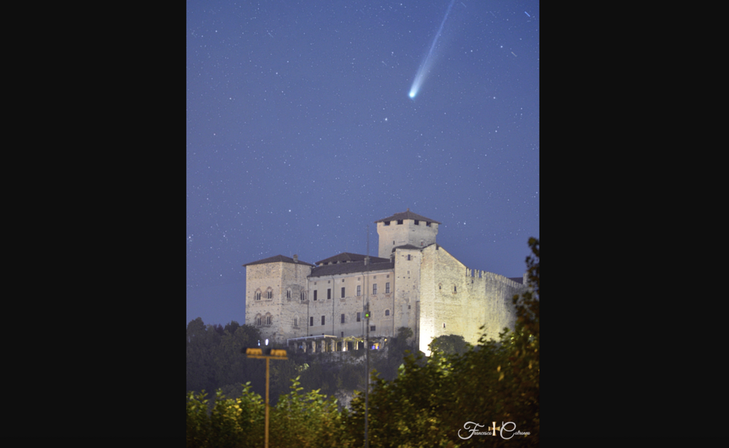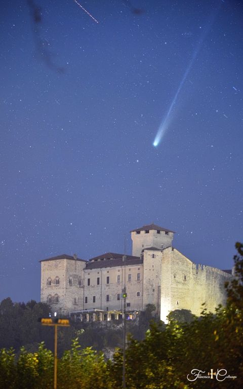 La magia del cosmo incontra la bellezza di questa terra. Il risultato è uno scatto magico: è quello immortalato da Francesco Cotroneo la sera dello scorso 24 ottobre ad Angera. Un'immagine splendida della cometa Lemmon C/2025 A6 proprio sopra la Rocca Borromeo di Angera, sul lago Maggiore.