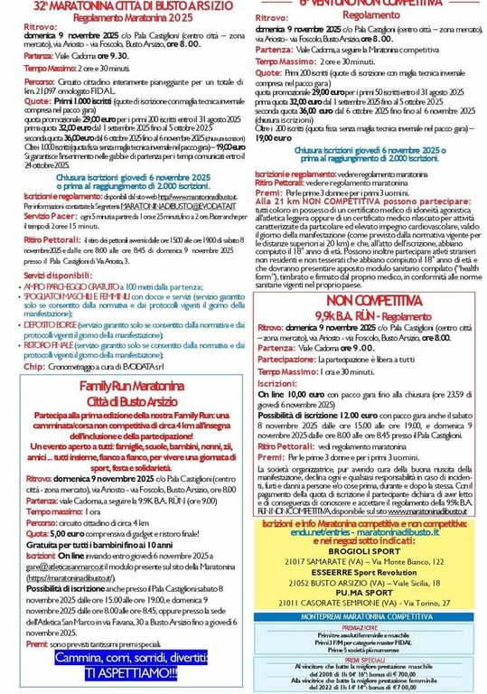 Edizione numero 32 per la Maratonina Città di Busto Arsizio, la corsa più attesa dai runner bustesi e non solo. Domenica 9 novembre saranno in realtà quattro le competizioni organizzate dall’Atletica San Marco in collaborazione con l’amministrazione comunale: quella principale, vale a dire la mezza maratona competitiva certificata Fidal; la 21 km non competitiva, che torna per il sesto anno; la 9.9 km BA Run non competitiva che si svolgerà lungo un percorso che coincide con la seconda parte della gara principale, compreso il passaggio in centro città.