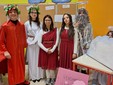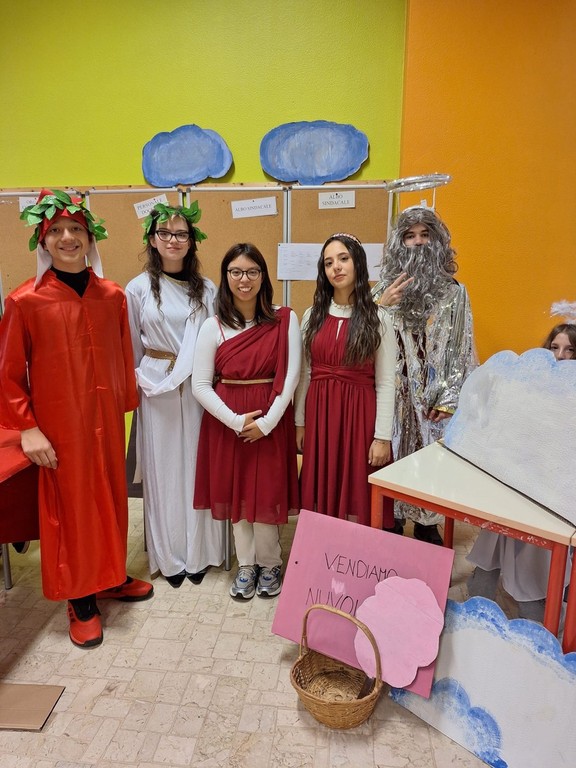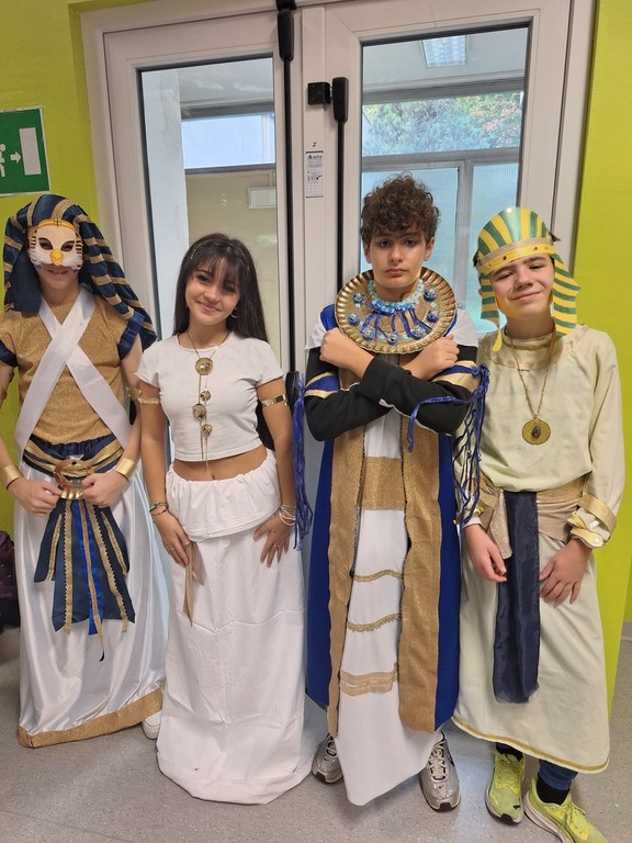 A ogni classe è stato assegnato un tema, sorteggiato tra gli argomenti affrontati nel triennio — dall’antico Egitto all’Unità d’Italia, passando per le scienze naturali e la biologia — e da lì è nata una piccola rappresentazione teatrale. Gli studenti si sono occupati di tutto: costumi, scenografie, testi e persino musiche, privilegiando l’uso di materiali di recupero in un’ottica sostenibile.