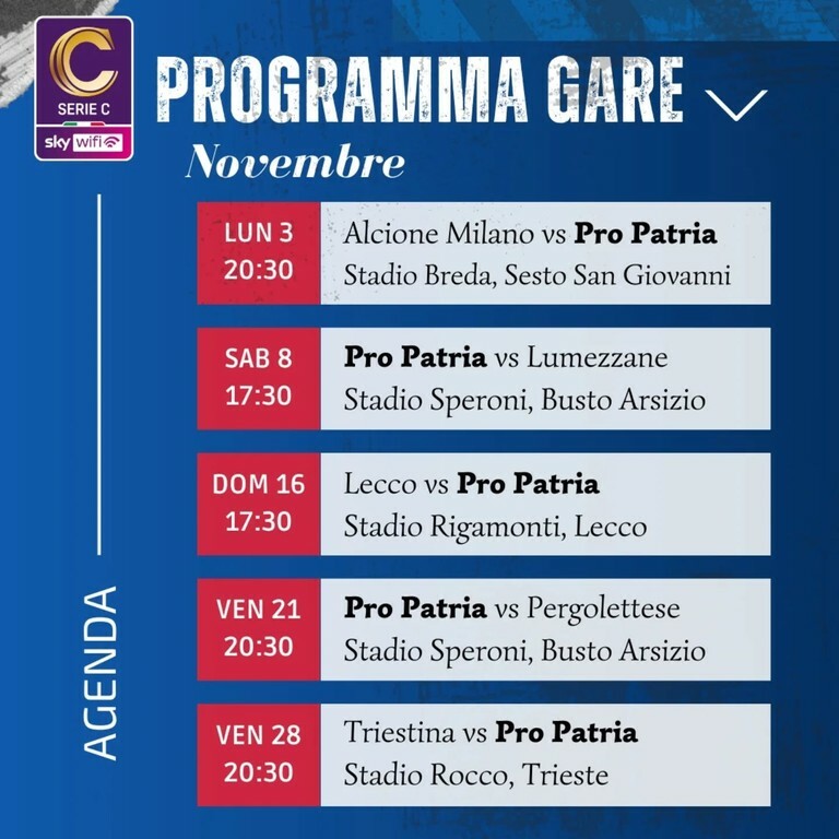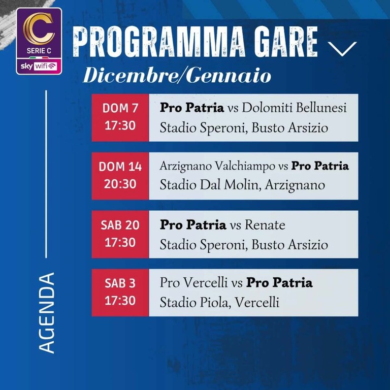 Quattro partite per chiudere il girone d’andata, inaugurare il ritorno e - si spera - anche un nuovo anno all’insegna del riscatto. È questo il percorso che attende la Pro Patria tra dicembre e gennaio, con in mezzo la consueta sosta natalizia.