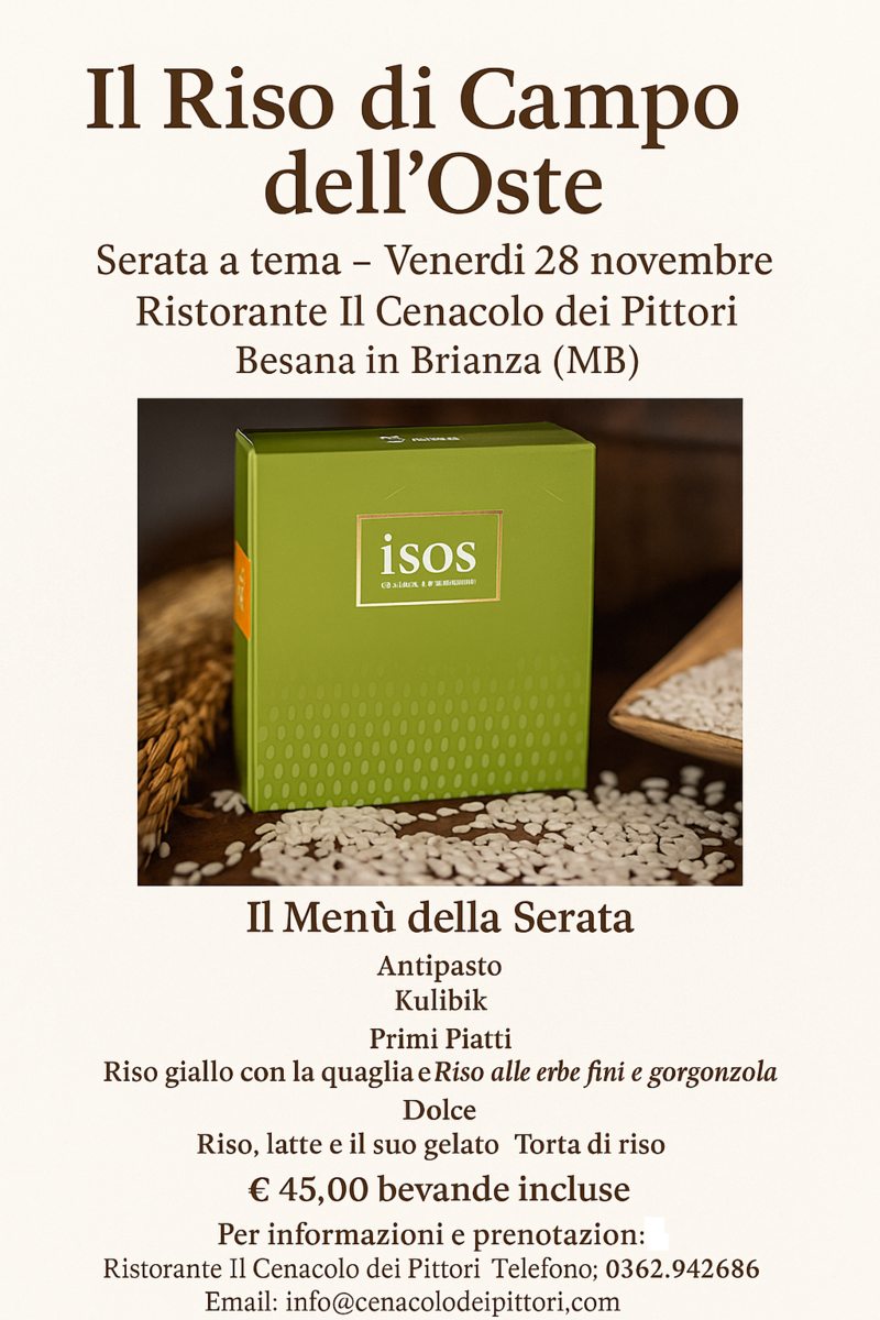 Il riso non è solo un ingrediente: è cultura, tradizione, paesaggio. È un racconto fatto di acqua, terra e pazienza, capace di trasformarsi ogni volta in qualcosa di diverso, senza mai perdere la sua identità. Ed è proprio il riso il grande protagonista della serata tematica organizzata dal Ristorante Il Cenacolo dei Pittori a Besana in Brianza. Una cena dedicata a uno dei pilastri della cucina italiana, proposta come viaggio sensoriale alla scoperta di un prodotto d’eccellenza: il Carnaroli selezione Isos di Campo dell’Oste, fiore all’occhiello dell’azienda agricola.
