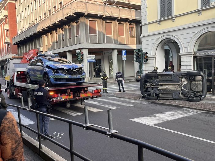 FOTO. Scontro in centro a Varese tra un'auto della polizia e una Panda: tre persone soccorse e vetrina sfondata