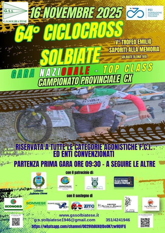 Il Ciclocross di Solbiate è aperto a tutte le categorie agonistiche FCI: Master 1/2/3/4 M/F, G6 M/F, Esordienti M/F, Allievi M/F, Junior M/F, Under 23 M/F, Elite M/F e agli enti convenzionati.