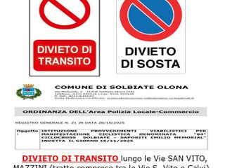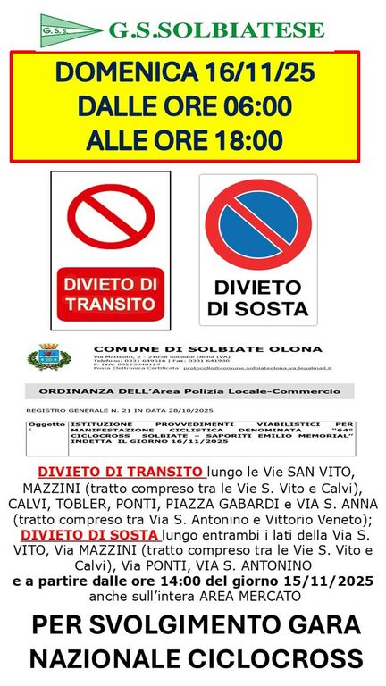 In vista del 64° Ciclocross Solbiate - Trofeo Emilio Saporiti, in programma domenica 16 novembre (LEGGI QUI), il Comune di Solbiate Olona ha disposto una serie di provvedimenti viabilistici per garantire lo svolgimento in sicurezza della manifestazione nazionale. Le misure, stabilite dall’ordinanza della polizia locale, saranno in vigore dalle 6 alle 18, con possibili disagi alla circolazione.