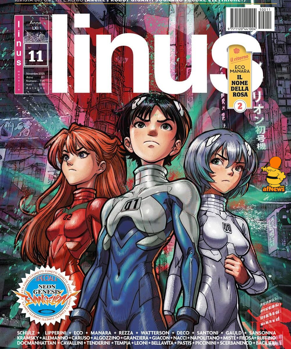 La copertina del numero di Linus di novembre, realizzata (e ciascuno darà a questo termine il valore che ritiene più opportuno) da Gianluca Bernardini, riporta un disegno evocativo di Evangelion che è stato ottenuto grazie all’utilizzo dell’AI.