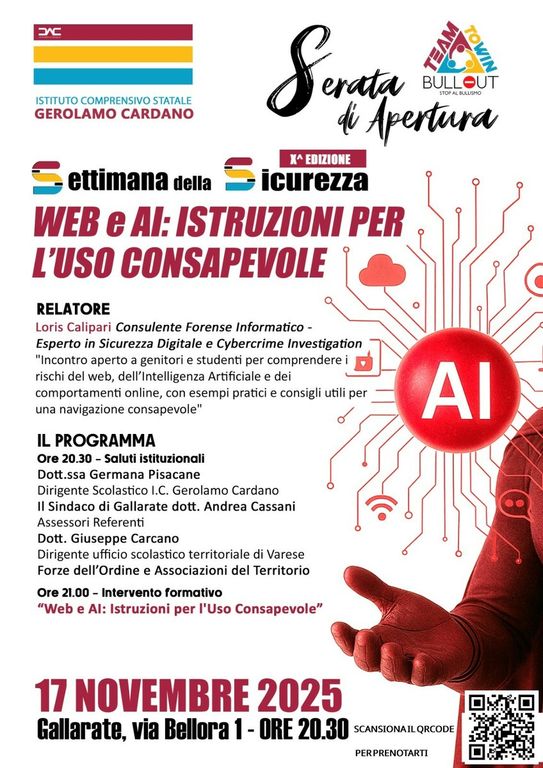 Prende ufficialmente il via a Gallarate la Settimana della Sicurezza, un percorso di sensibilizzazione dedicato ai temi più urgenti dell’era digitale. Questa sera lunedì 17 novembre 2025, alle 20.30 in via Bellora 1, l’Istituto Comprensivo Gerolamo Cardano apre le porte a genitori, studenti e cittadini per l’incontro “Web e AI: Istruzioni per l’Uso Consapevole”, un appuntamento che mette al centro l’educazione alla sicurezza informatica e alla responsabilità digitale (locandina in fondo).