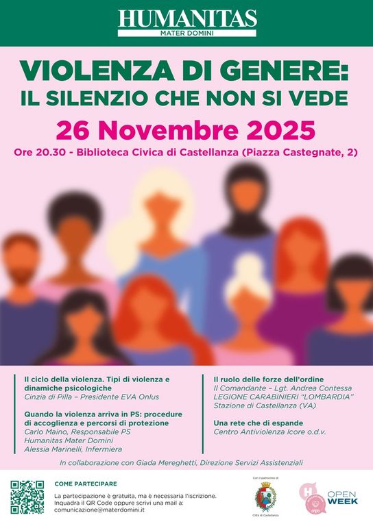 Il giorno successivo, 26 novembre, l’approfondimento prosegue con l’incontro «Violenza di genere: il silenzio che non si vede», organizzato da Humanitas Mater Domini in collaborazione con Giada Mereghetti della Direzione Servizi Assistenziali. La serata affronterà il fenomeno attraverso una prospettiva multidisciplinare che coinvolge il sistema sanitario, le forze dell’ordine e la rete territoriale dei centri antiviolenza. L’evento analizzerà il ciclo della violenza e le dinamiche psicologiche, le procedure di accoglienza e i percorsi di protezione attivati nei pronto soccorso, il ruolo delle istituzioni nella tutela delle vittime e l’importanza di una rete che sappia espandersi sul territorio. La partecipazione a entrambi gli eventi è gratuita. Per l’incontro del 26 novembre è necessaria l’iscrizione inviando una mail di conferma a comunicazione@materdomini.it.