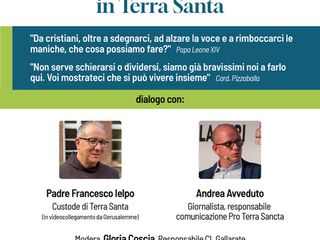 Il dialogo vedrà protagonisti: Padre Francesco Ielpo, Custode di Terra Santa, che interverrà in video collegamento da Gerusalemme, portando la voce di chi vive ogni giorno, con coraggio e perseveranza, la complessità del contesto mediorientale. Andrea Avveduto, giornalista e Responsabile della Comunicazione di Pro Terra Sancta, associazione impegnata nel sostegno alle popolazioni colpite e nella tutela dei luoghi sacri. A moderare l’incontro sarà Gloria Coscia, Responsabile di Comunione e Liberazione Gallarate, promotrice dell’iniziativa.