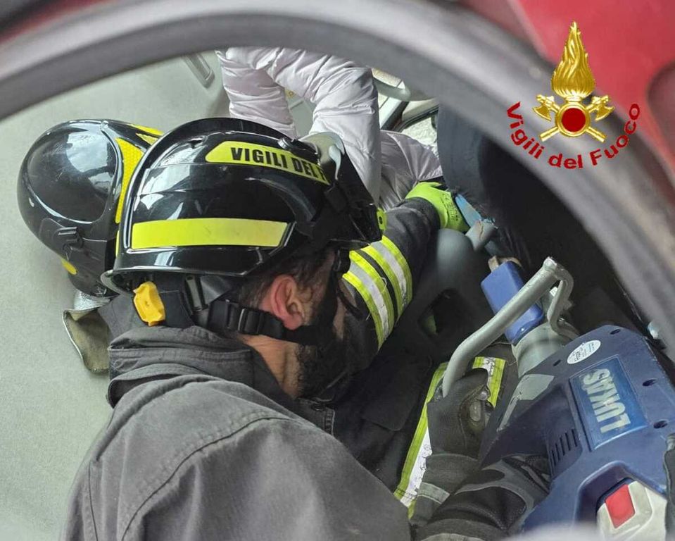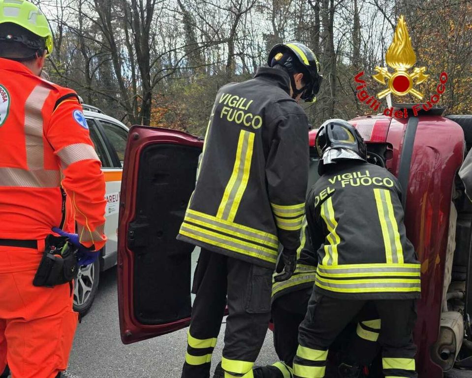 FOTO. Si ribalta con l'auto a Solbiate Arno: donna di 58 anni estratta dall'abitacolo dai vigili del fuoco